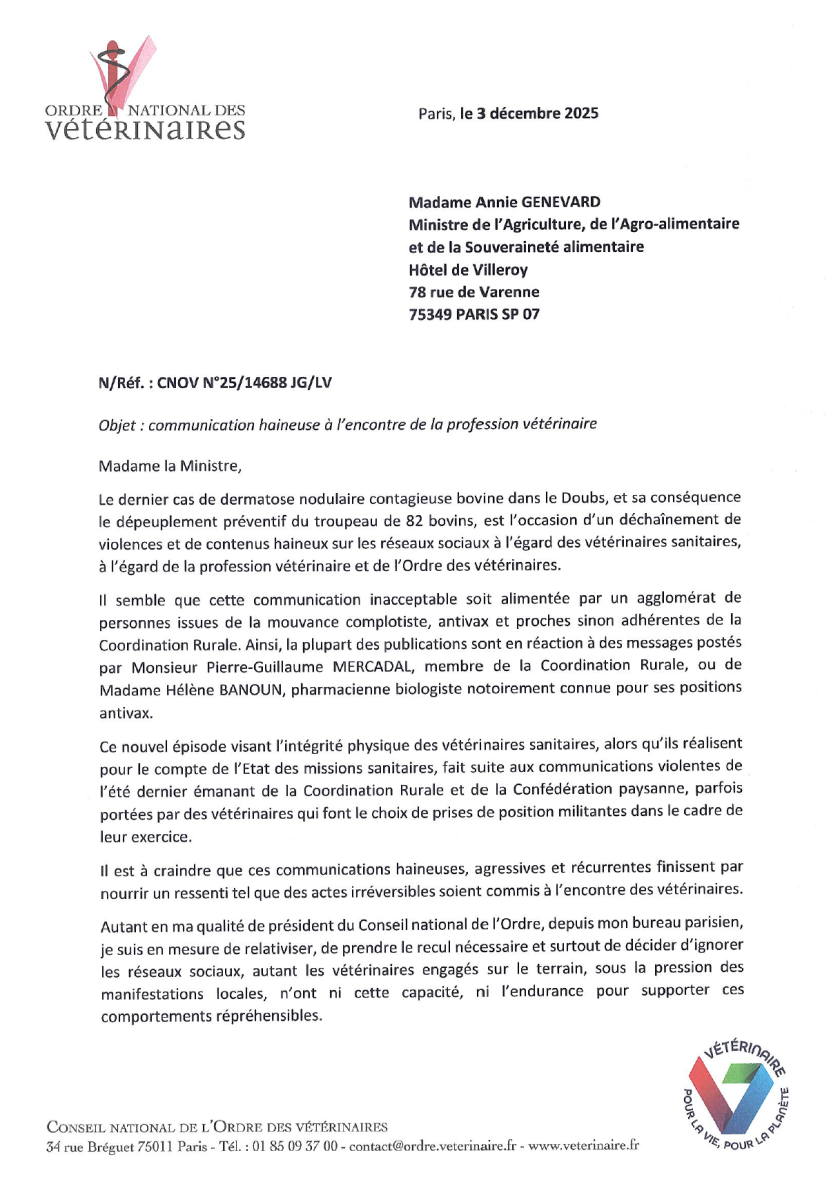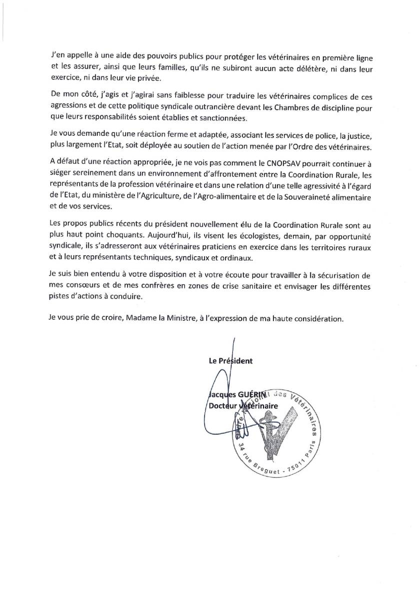 Lettre du Président Jacques Guérin à Madame la Ministre de l'Agriculture