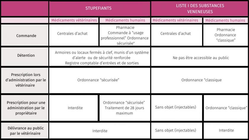 Commande à usage professionnel sur ordonnance sécurisée (art. R 5132-5 du CSP) dont le double est conservé 3 ans par le pharmacien. La pharmacie est déclarée par le vétérinaire auprès de son CROV. Les commandes sont limitées à 10 unités de prise par praticien (provision pour soins urgents) (art. R 5132-31).